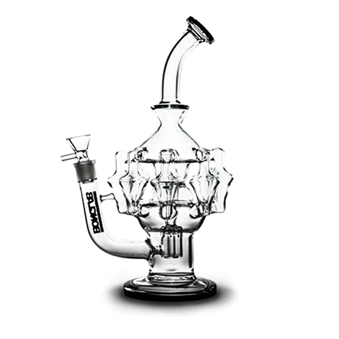 Su quemador macho de 14 mm para hierba seca se conecta directamente a un difusor integrado que inicia el primer proceso de filtrado. Desde ahí, el humo pasa a una cámara tubular donde se distribuye hacia ocho brazos percoladores, los encargados de entregar una calada más suave, fresca y estable.